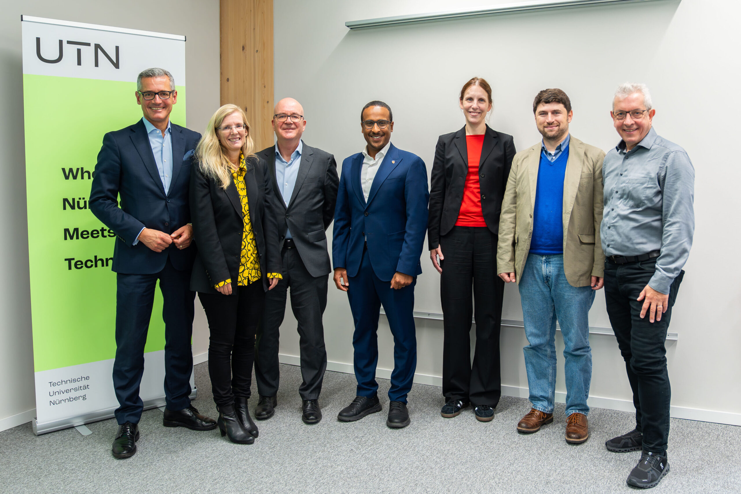 V.l.n.r. Dr. Michael Fraas (Kanzler), Prof. Dr. Isa Jahnke (Gründungsvizepräsidentin für Studium, Lehre und Internationales), Prof. Dr. Michael Huth (Gründungspräsident), Dr. Nasser Ahmed (Vorsitzender SPD Nürnberg), Prof. Dr. Gyburg Uhlmann (Gründungschair Department Liberal Arts and Social Sciences), Prof. Dr. Josif Grabocka (Professor für Machine Learning), Prof. Dr. Wolfram Burgard (Grundungschair Department Computer Science and Artificial Intelligence)