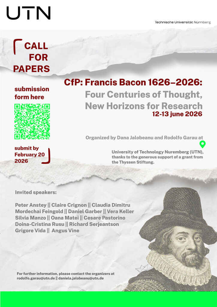 Wir begrüßen Vorschläge zu Themen wie (ohne darauf beschränkt zu sein): Francis Bacon jenseits der philosophisch-literarischen Trennung; das Verhältnis von Methode, Metaphysik und Naturgeschichte in Bacons Denken; Bacons Auseinandersetzung mit der experimentellen Philosophie der Frühen Neuzeit; seine Bezüge zu Medizin, Recht, Politik und Rhetorik; die europäische Rezeption Bacons im 17. und 18. Jahrhundert; Bacon und der Empirismus, einschließlich vergleichender Perspektiven; sowie Bacons Einfluss auf spätere Philosophie, Wissenschaft und Literatur.