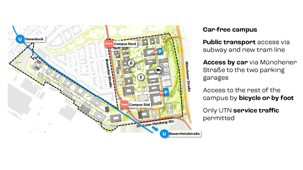 The rest of the campus is being developed from north to south, beginning with the founding buildings. These include spaces for departments and research, as well as administrative units. A parking garage and an energy and logistics center with an innovative heat storage system are also being built. The UTN site offers excellent public transport connections, with direct access to both the subway and the new tram line. Two new stops—one in the north and one in the south of the campus—are being constructed on the site.