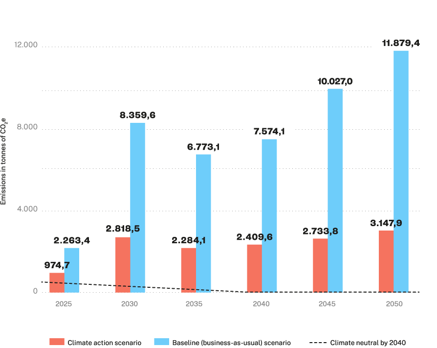 The reference scenario shows how much emissions could rise if no targeted climate action measures are taken. This contrasts with the climate action scenario, which shows how emissions can be significantly reduced through strategic and responsible action.
