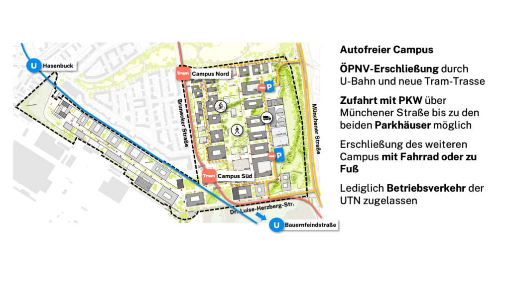 Der restliche Campus wird von Nord nach Süd erschlossen, beginnend mit den Gründungsgebäuden. Diese umfassen Flächen für die Departments und Forschung, aber auch administrative Bereiche. Zudem entsteht ein Parkhaus sowie ein Energie- und Logistikzentrum mit innovativem Wärmespeicher. Das Areal der UTN ist sowohl über die U-Bahn als auch über die neue Straßenbahntrasse hervorragend an den öffentlichen Personennahverkehr angebunden. Hierfür entstehen auf dem Gelände je eine neue Haltestelle im Norden und im Süden des Campus.